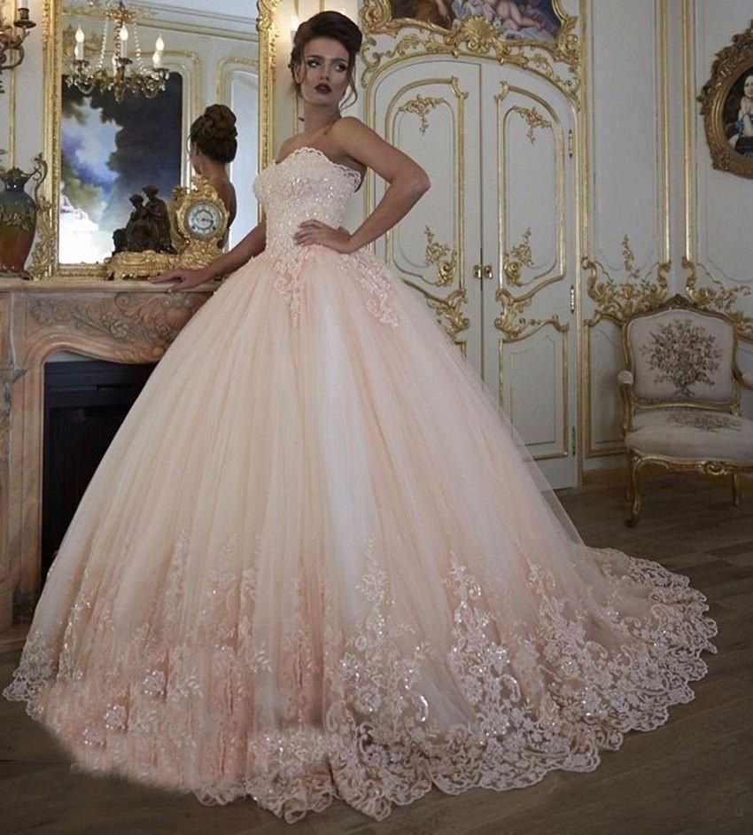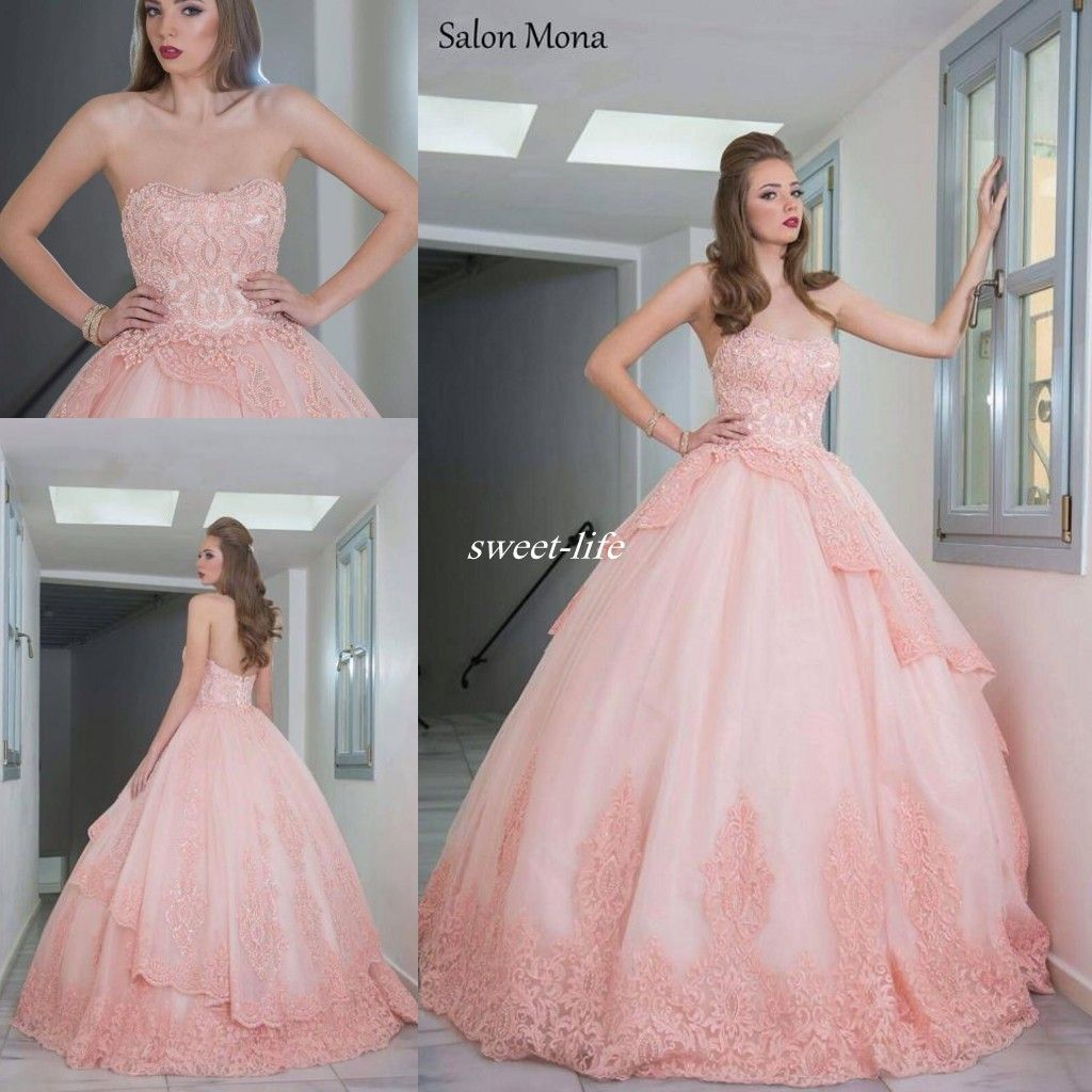 Salon Mona 2016 Blush Pink Ball Gown Wedding Dresses Strapless Pearls Applique Lace Custom Made Sexy Bridal Gowns For Spring Outdoor Wedding