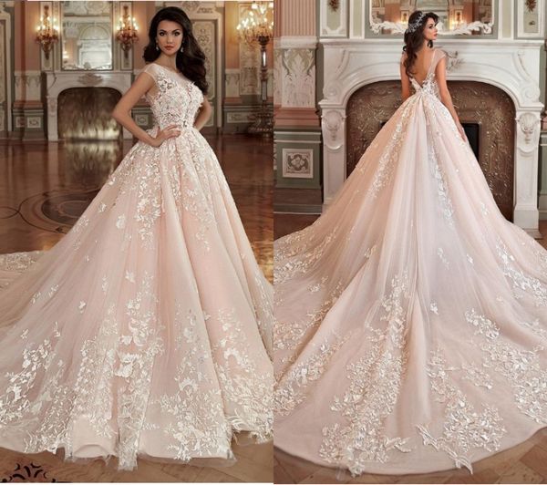 Discount 2018 Gorgeous Blush Pink Wedding Dresses Ball Gown Sheer Neck 3d Flowers V Back Appliqued Lace Bridal Gowns Wedding Dress Manufacturers