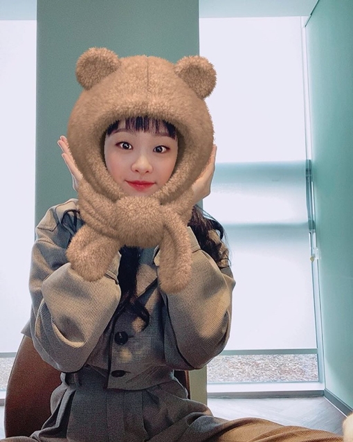 The photo shows Kim Da-mi wearing a bear mask using a mobile phone application.