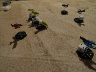 The Ork Ace and Fighta 3 try to bracket the Chaos craft, but don;t seem to get the angle. Meanwhile, the Chaos fighters move to cover the landing.